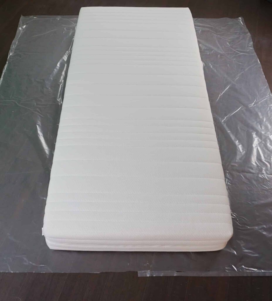 Breiten Sie die Folie glatt und vollflächig auf dem Boden aus. Achten Sie darauf, dass keine Falten entstehen. Legen Sie anschließend Ihre alte Matratze inklusive Bezug mittig auf die Folie.